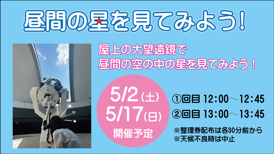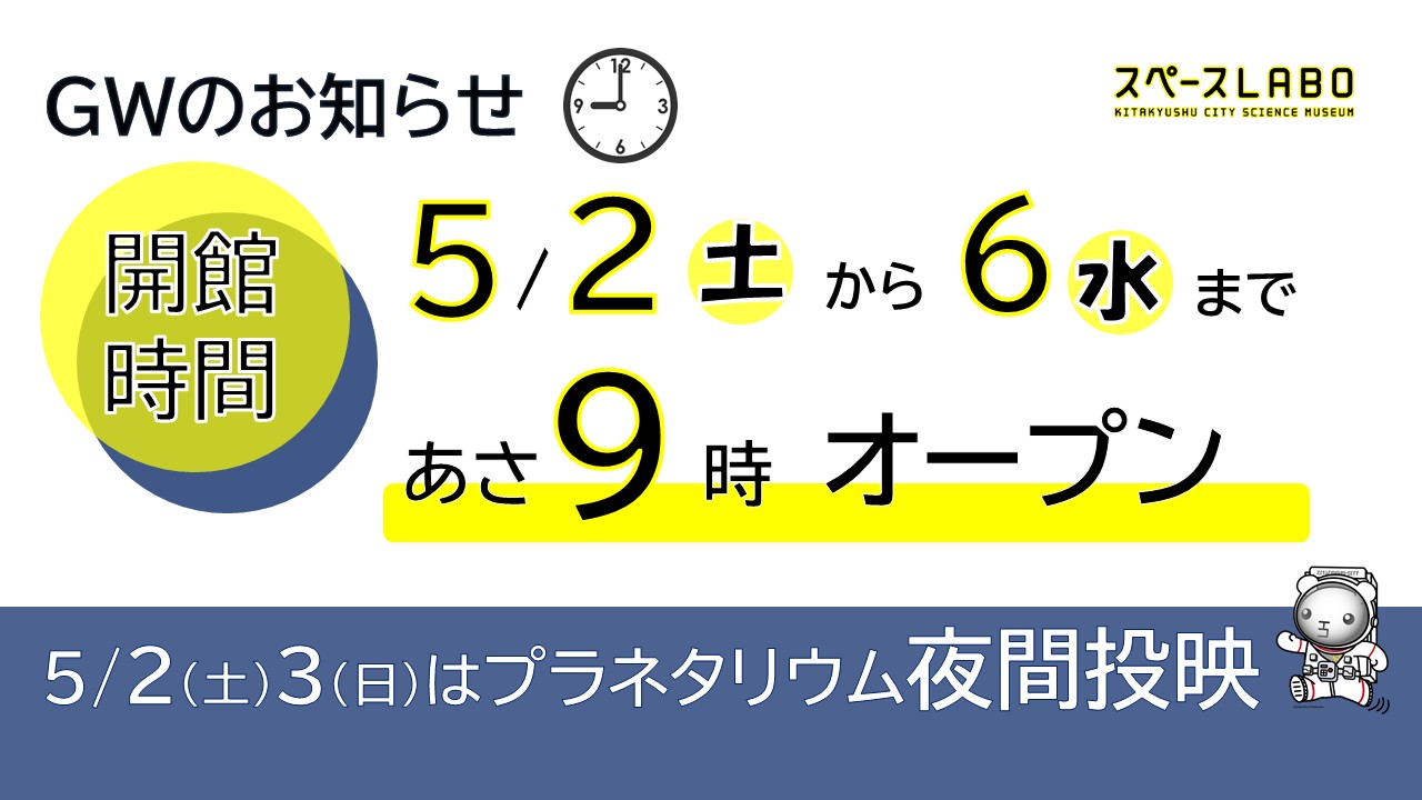 (5/2~5/6)開館時間の変更(アーリーオープン)とプラネタリウム夜間投映のお知らせ -