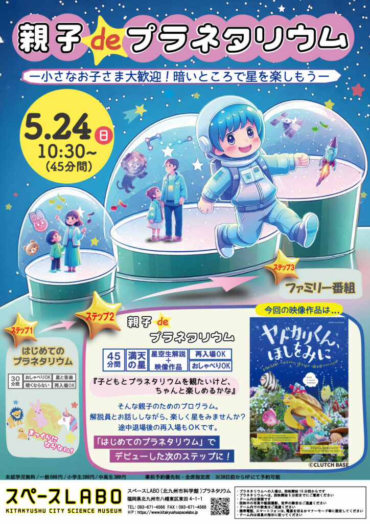 『子どもとプラネタリウムを見たいけど、ちゃんと楽しめるかな』そんな親子のためのプログラム。解説員とお話ししながら、楽しく星をみませんか?途中退場後の再入場もOKです。星空を楽しんだ後は、みんなで「ヤドカリくん、ほしをみに」を見よう。「はじめてのプラネタリウム」でデビューした次のステップに!