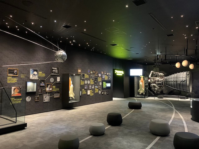 デジタルプラネタリウムの機能も搭載し、88種類の星座絵や星座線、惑星やメシエ天体などの各種画像を投映することは勿論、天文学の各種データにより、宇宙の大規模構造や宇宙空間から見る太陽系惑星の運動、あるいは日月食などの天文現象を再現することができます。また、12台のプロジェクターをスクリーンの周囲に配置し、地上の風景動画を水平解像度20Kで超高精細に周囲に投映することで、まるでその場に居るような北九州の風景を映し出します。